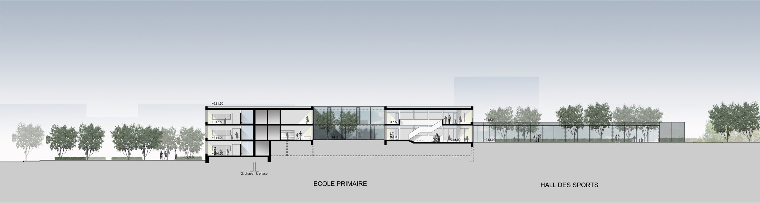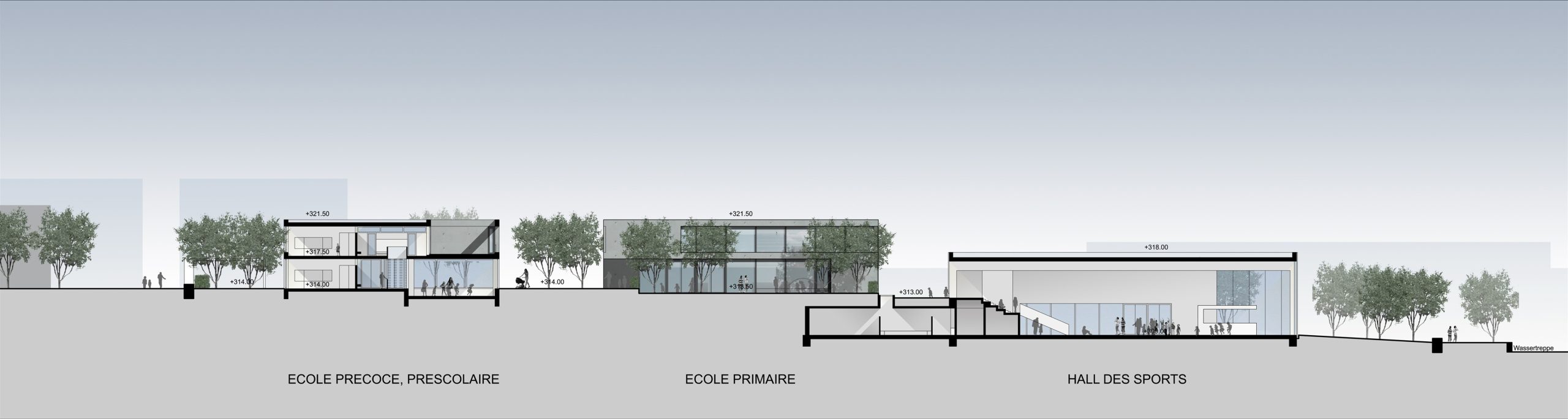 chaque fonction du programme appelle un bâtiment particulier adapté à la tranche d’âge concernée. maison relais et école préscolaire en limite de rue desservante sont rapidement accessibles tandis que l’école primaire par sa population plus âgée accepte une disposition plus en retrait. le bâtiment sportif par son volume et son ouverture au public exige un traitement à part, en lisière du parc.