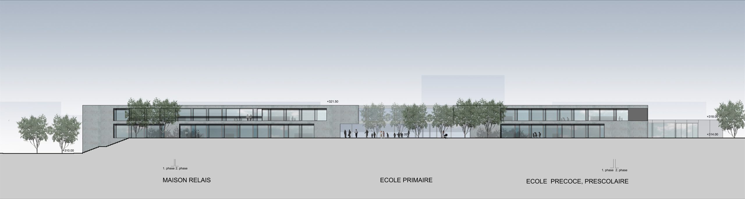 le futur centre scolaire comprend dans sa version définitive une école primaire (3825 m²), une école précoce et préscolaire (1760 m²) une maison relais (2790 m²) et un hall des sports (3440 m²).