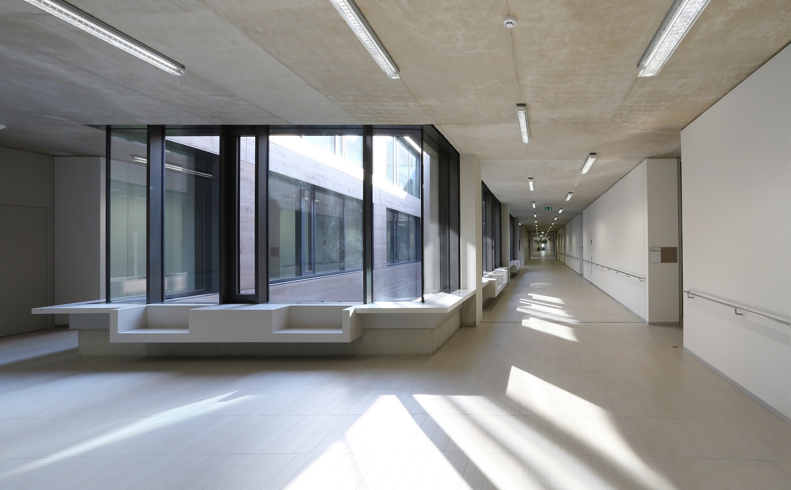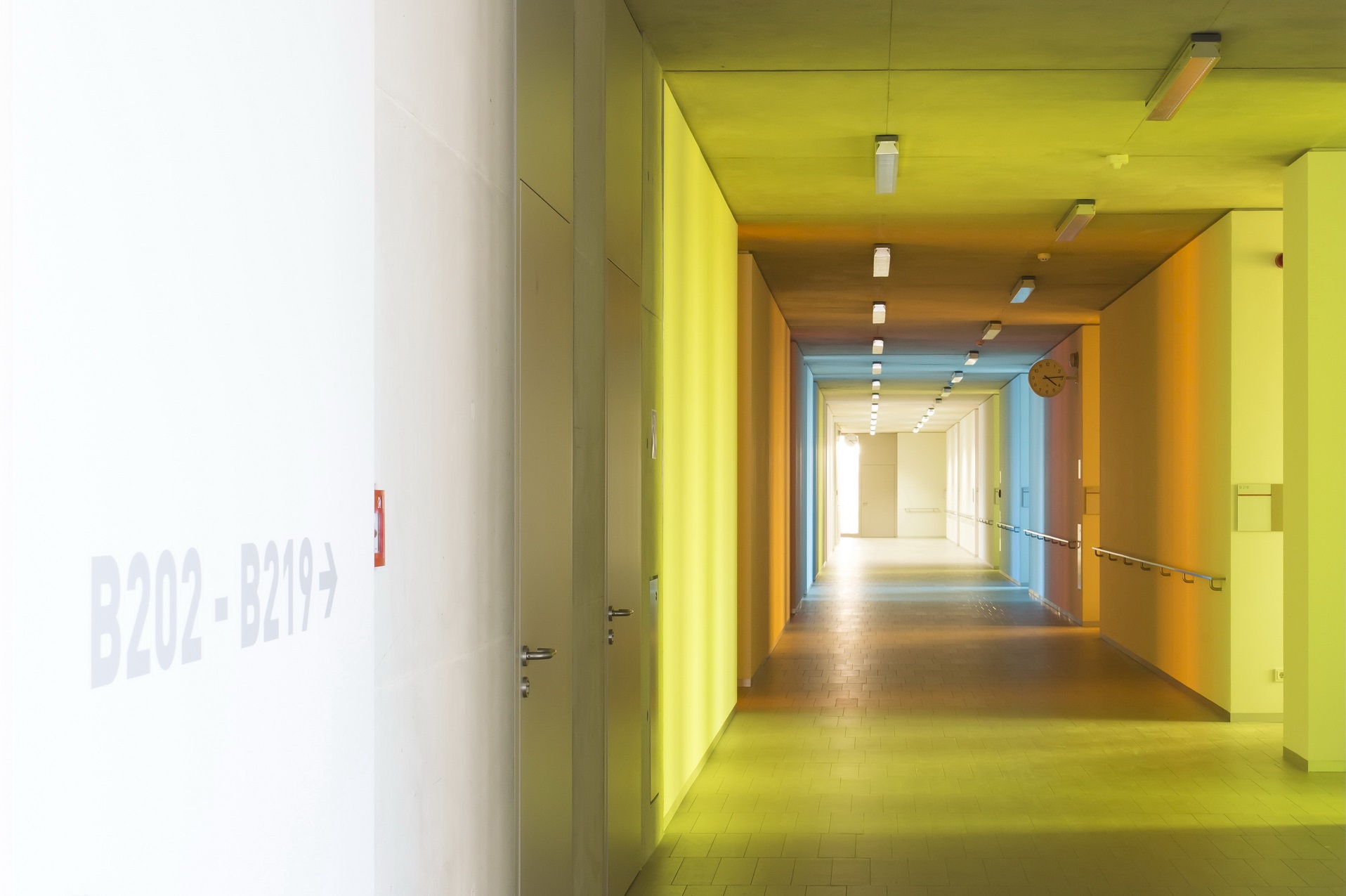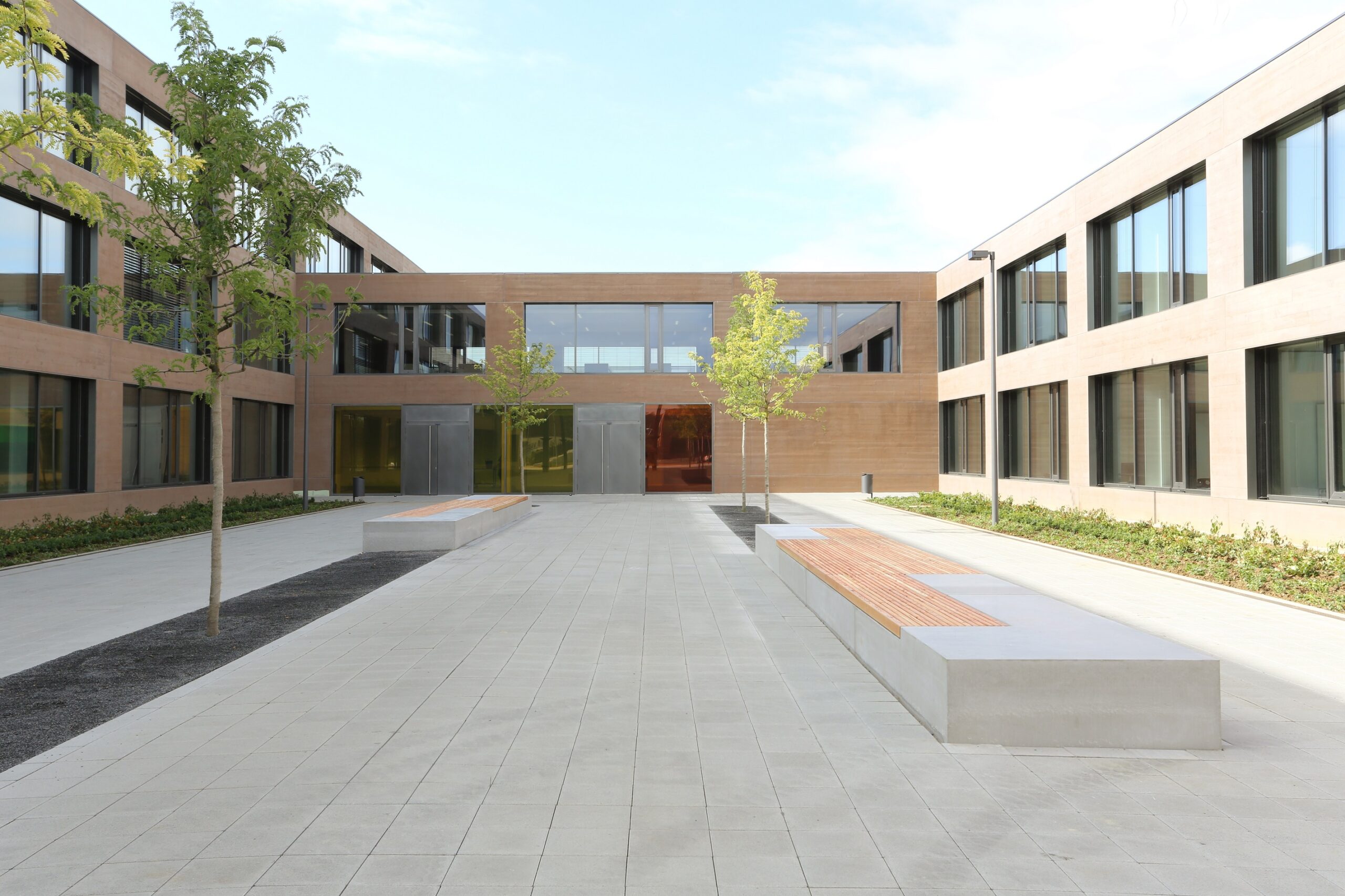 Le contexte du projet n’est pas seulement fourni par le paysage mais aussi par le tracé de végétation traversant le campus et ses six bâtiments. Ainsi l’environnement naturel n’est pas seulement préservé tant bien que mal, mais il est le principe constitutif du projet. L’opposition entre la nature changeante au gré des saisons et l’objet architectural à la géométrie immuable définissent l’atmosphère si particulière du projet.