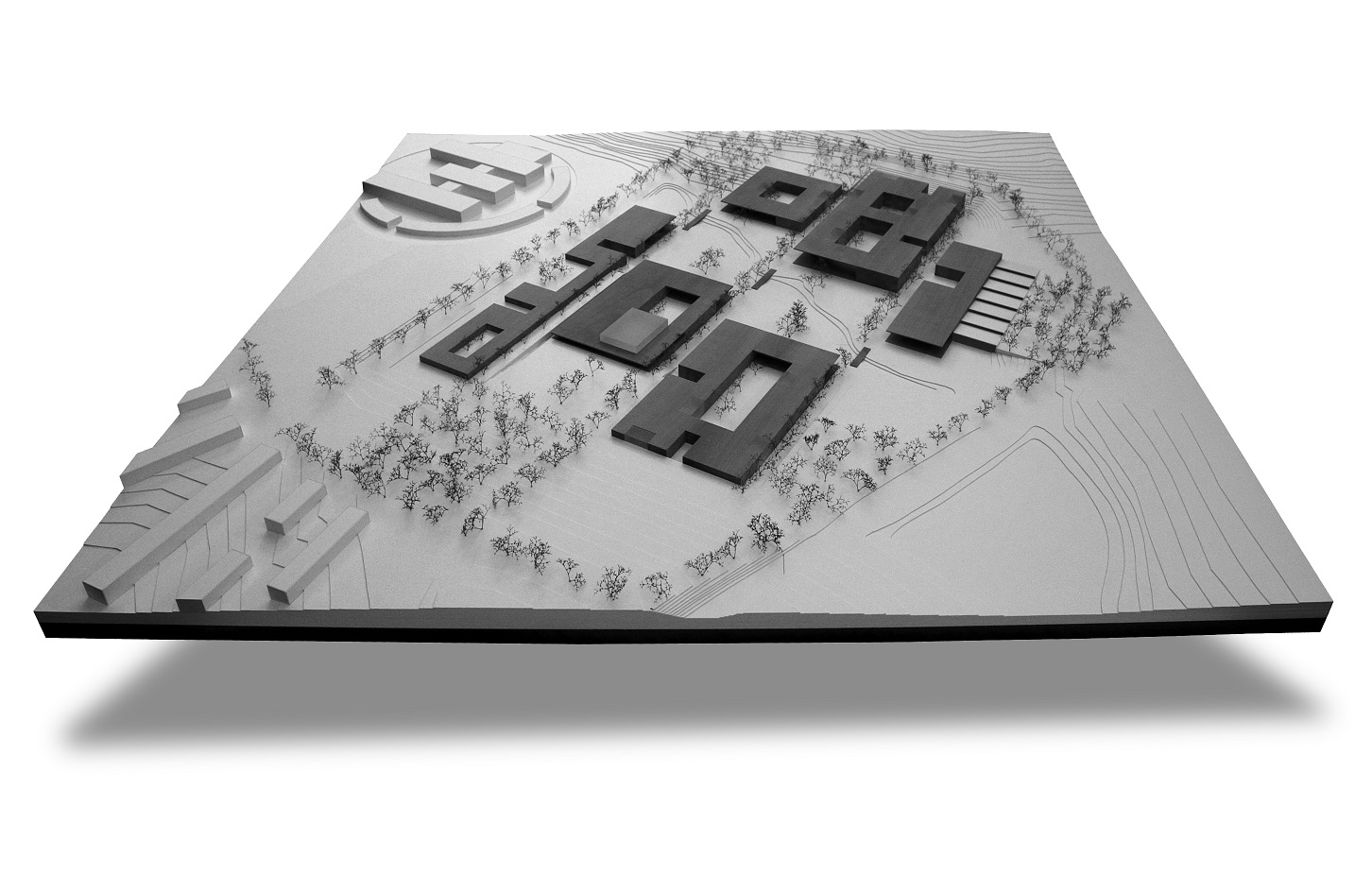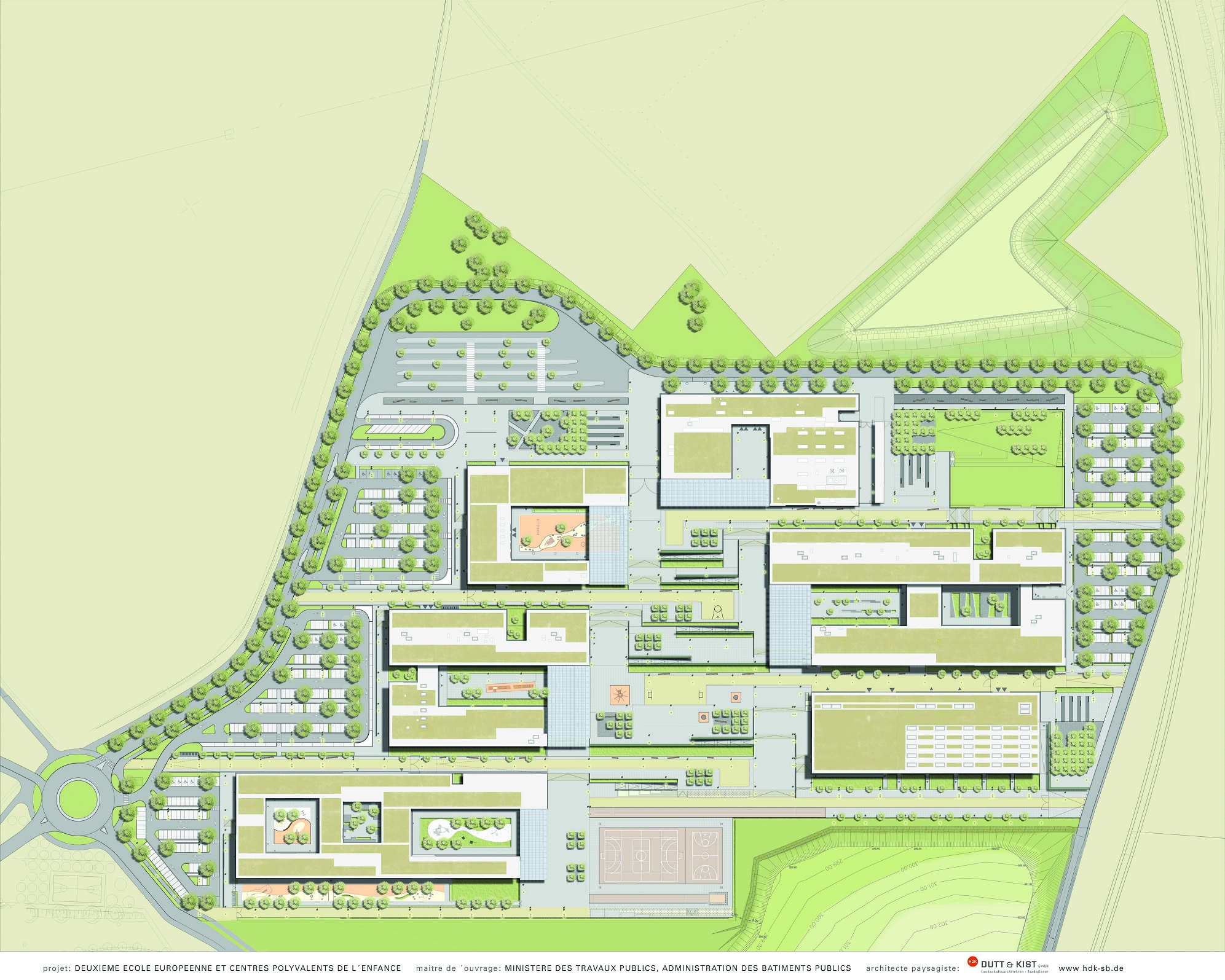 Une nouvelle voie embrassant le campus scolaire est tracée à partir de l’accès au lycée existant. Dans la bulle délimitée par la rue périphérique les bâtiments du campus sont insérés dans un tracé de lignes parallèles issues d’une trame garante d’un ordre général omniprésent. Le front des bâtiments percé de voies parallèles délimite le campus scolaire vers l’extérieur. A travers cette limite l’accès au cœur de l’ensemble scolaire est filtré pour garantir le fonctionnement sécurisé des écoles.