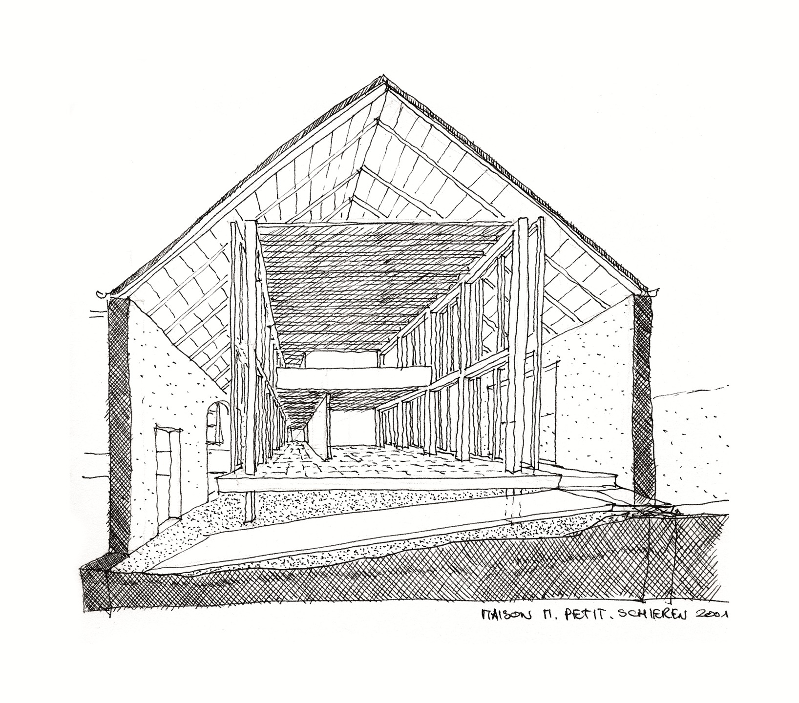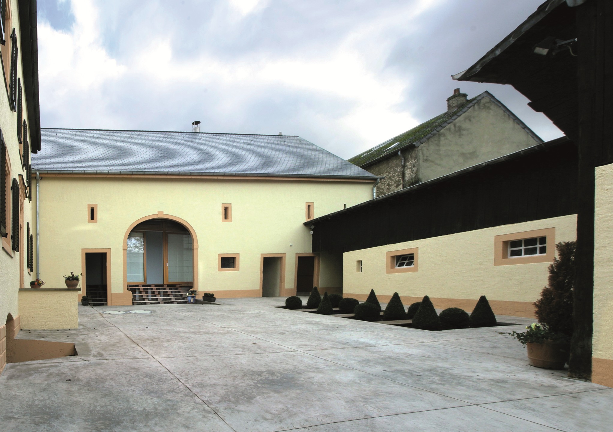 la ferme rénovée comporte une suite de bâtiments qui se regroupent autour de deux cours accessibles par la route principale du village. la cour donnant sur la maison d’habitation sert de plaque tournante desservant la maison ancienne et la grange qui recèle l’extension nouvelle de la zone habitable.