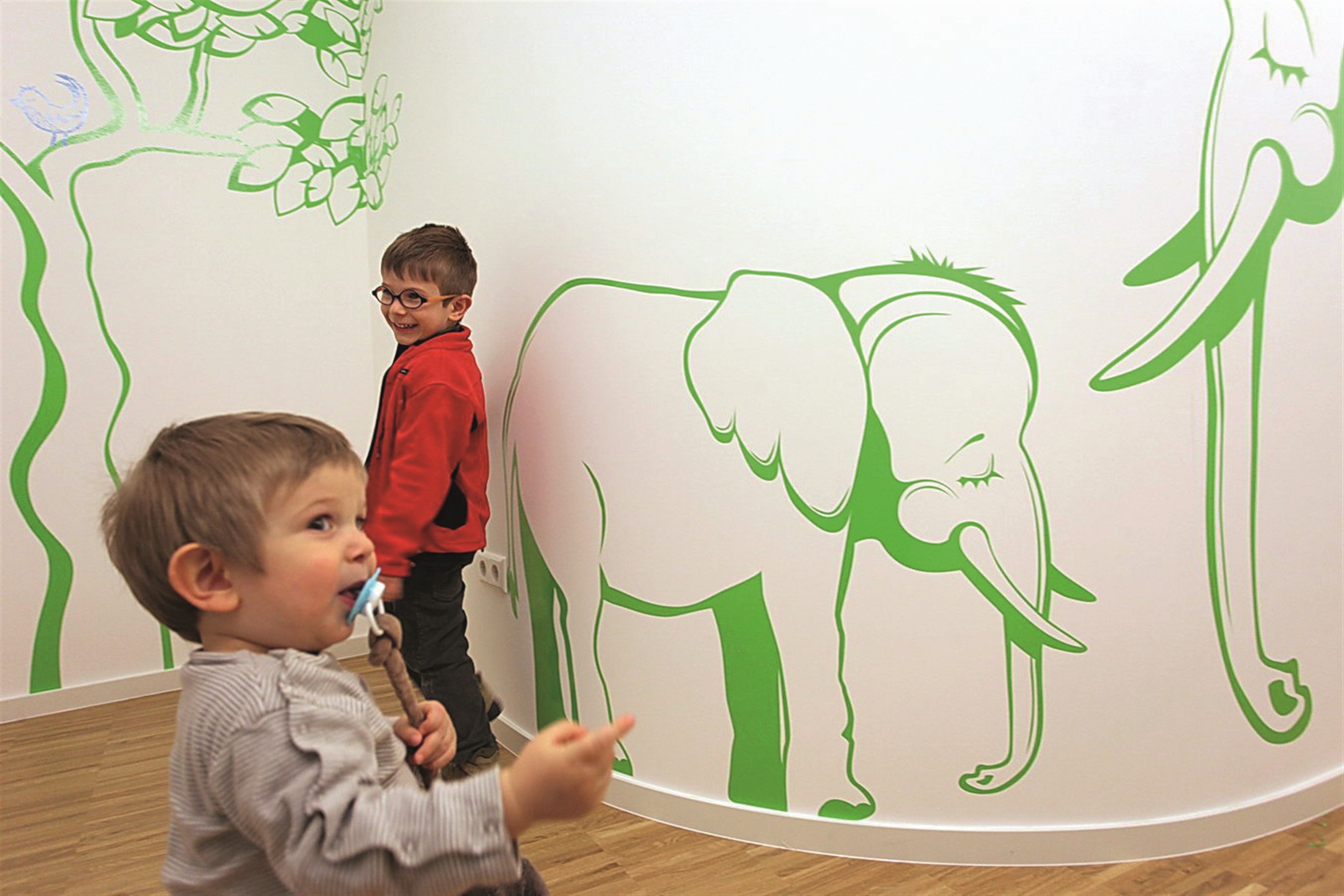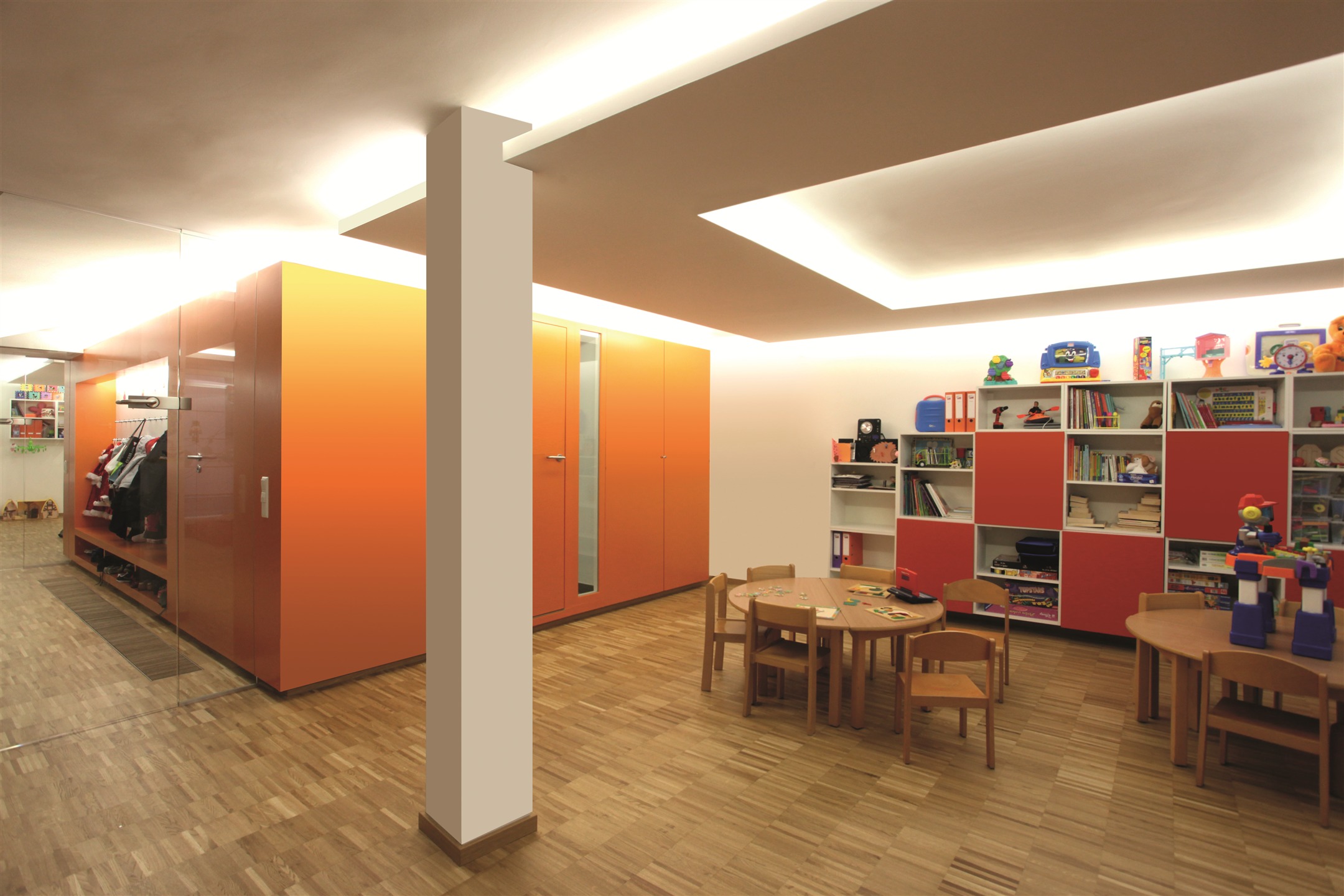 L’intérieur d’un vénérable immeuble d’habitation appartenant au patrimoine de la vieille ville a été aménagé avec minutie et sens du détail en foyer de jour pour enfants en bas âge. Deux surfaces ouvertes par de larges baies vitrées sur l’espace public sont aménagés en cocons protecteurs pour enfants confiés à l’attention d’une équipe d’éducateurs attentifs. La disposition des espaces est étudiée pour donner à des enfants en bas âge des espaces de jeu et de repos adéquats et accueillants.
