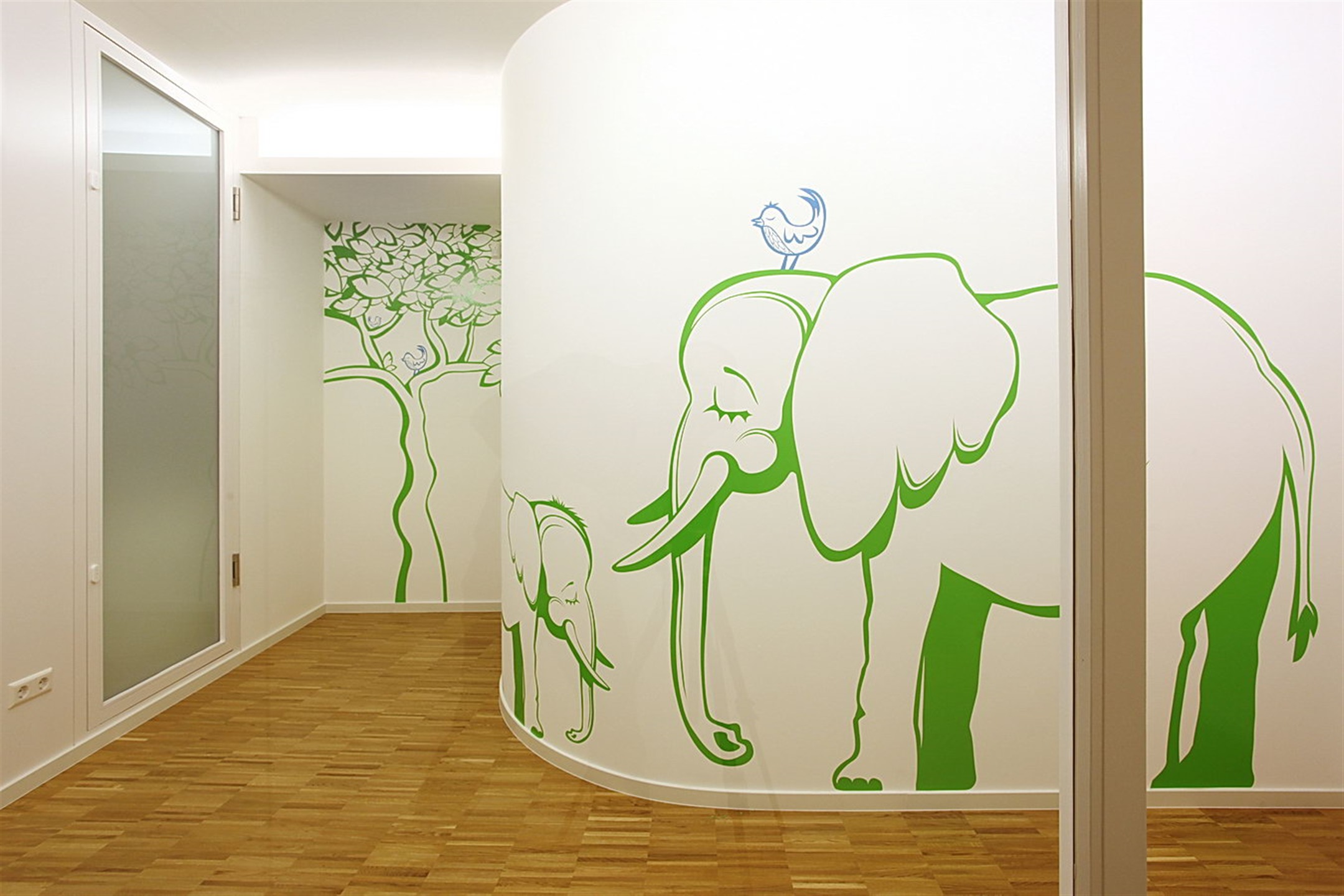 Les murs blancs et le parquet en bois offrent un arrière fond neutre sur lequel un espace coloré orange et un autre relevé de girafes vertes et petits oiseaux bleus sont mis en scène. Ces deux interventions à la géométrie simple et rectiligne sont soulignées par un éclairage indirecte diffus et à lumière douce évitant toute source d’éblouissement. Cet espace voulu par l’Union Commerciale de la Ville de Luxembourg s’inscrit dans la suite des commerces qui en ville cherchent à se distinguer par leur design contemporain et novateur.