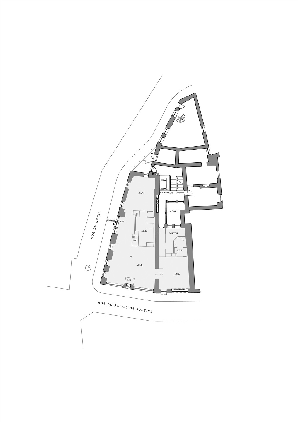 L’immeuble de coin de la rue du Nord et de la rue du Palais de Justice accueille en centre ville la crèche des « kids and the city ». Les grandes vitrines donnant sur la rue du Palais de Justice offrent au promeneur le temps de son passage l’atmosphère vivifiante de la jeunesse insouciante qui a adopté avec plaisir ces lieux centenaires.